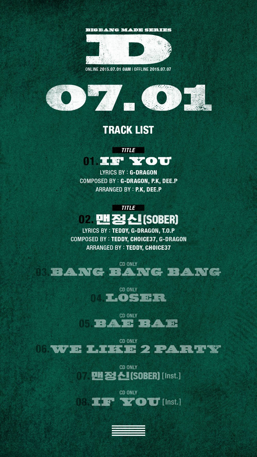 يستعد فتيان فرقة بيغ بانغ (Big Bang) لعودتهم القادمة من خلال إصدارهم لمجموعة صور تشويقية وكشفهم عن قائمة ألبومهم القادم D وهو الإصدار الثالث من سلسلتهم MADE والذي سيصدر بتاريخ ١ يوليو.